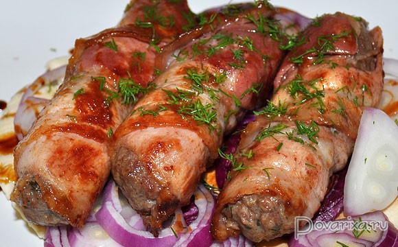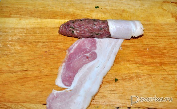 Из шариков формуем тонкие колбаски-чевапчичи, которые оборачиваем полоской бекона.