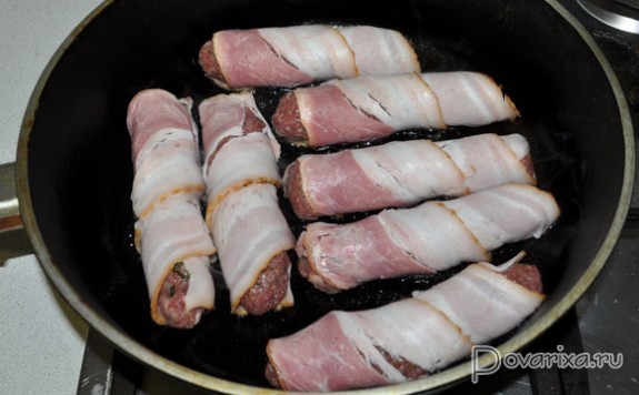Когда снизу бекон подрумянился – убираем огонь до почти среднего. Жарим колбаски в общей сложности 18-20 минут, поворачивая с боку на бок, подрумянивая со всех сторон.