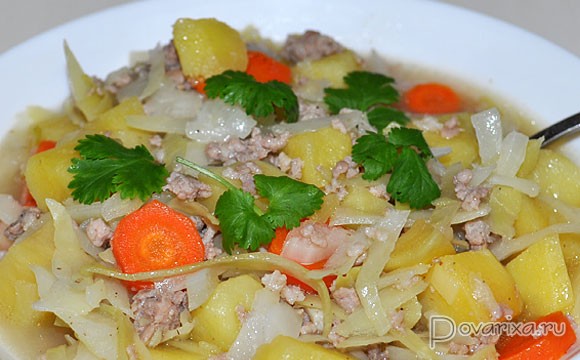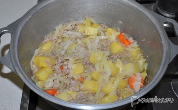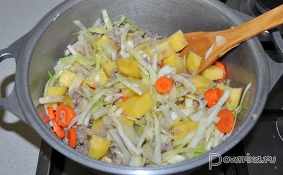Шинкуем капусту, нарезаем картофель, морковь и корень петрушки, добавляем к фаршу, заливаем немного воды, заправляем солью и перцем-горошком и оставляем на 20-25 минут тушиться под крышкой до готовности.