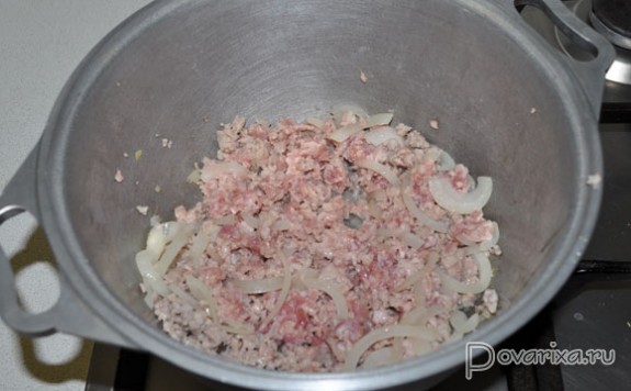 Разогреваем в толстостенной кастрюле (или латке) масло, слегка обжариваем фарш и нарезанный кольцами лук на огне повыше среднего, постоянно помешивая, чтобы фарш не взялся комочками, приправляем солью.
