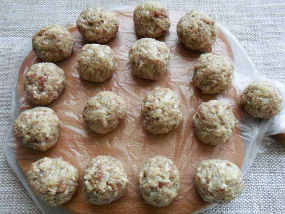 - Формуем небольшие тефтели (16-20 штук). На раскаленном растительном масле обжариваем буквально по минуте-полторы, до корочки, с обеих сторон и выкладываем на тарелку.