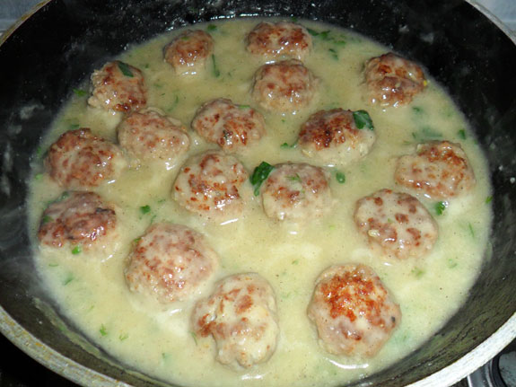 - Продолжая помешивать, начинаем не спеша, порциями, вливать горячий мясной бульон. Когда бархатистый соус стал однородным – закладываем в него тефтели, осторожно поворачивая лопаткой, чтобы они покрылись соусом. Дав закипеть, снижаем огонь, закрываем сковородку и на малом огне тушим около 10 минут, проверяя, не прилипает ли соус к дну.