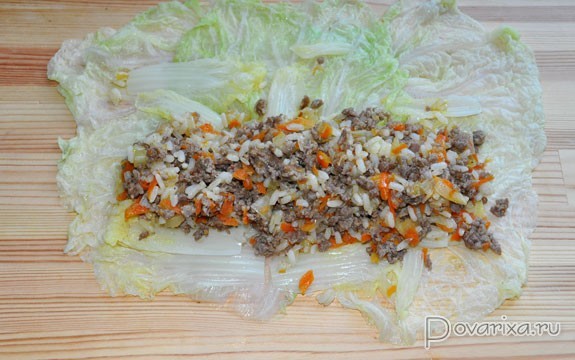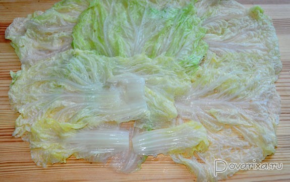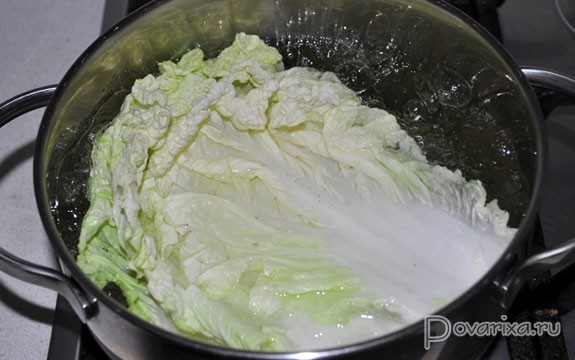 Для начала ставим варить рис, а у кочана пекинской капусты срезаем 2-3 см снизу – тогда листы ее очень легко снимаются. Опускаем по несколько штук в кипяток, через 2-3 минуты вынимаем, охлаждаем, складываем в дуршлаг. Кстати: толстые основания листьев с помощью ножа делаем потоньше до бланширования, потом это сложнее сделать.