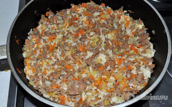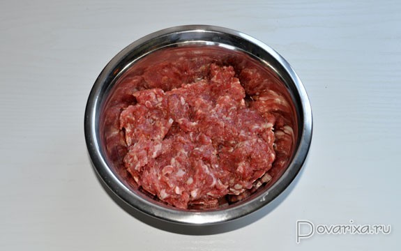 Пока с листьев стекает вода, в приготовленный дома или магазинный фарш закладываем приправы и специи на свой вкус. Прованские, Итальянские травы можем заменить ложкой хмели-сунели, вымешиваем.