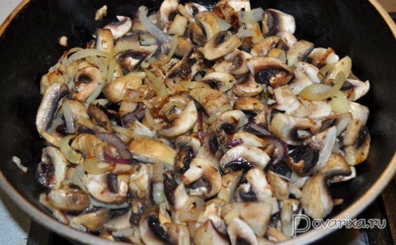 Вторую луковицу нарезаем полукольцами, пассеруем с маслом на среднем огне 6-7 минут, затем добавляем промытые, обсушенные и достаточно крупно нарезанные шампиньоны, томим в сковороде еще 5 минут, помешивая периодически. Солим и перчим, даем остыть.
