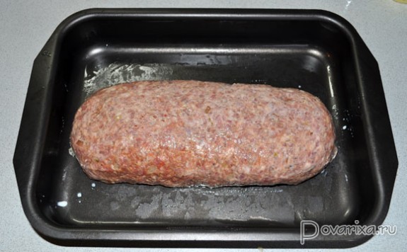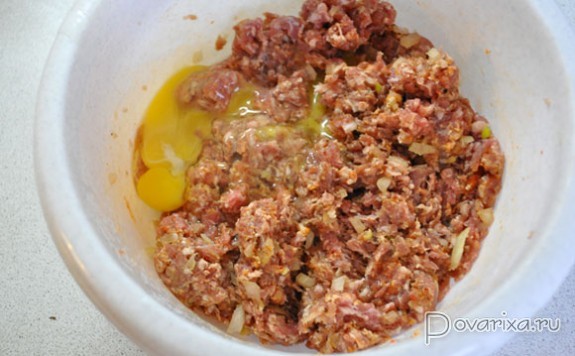 Фарш для этого рулета должен быть достаточно жирным, лучше – домашним. В него мы добавляем очень мелко шинкованную 1 луковицу, овсяные хлопья (или замоченные кусочки батона), приправы, яйцо, всё это вымешиваем как следует, даем постоять.