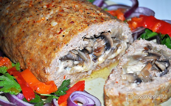 Если фарш у нас домашний – он плотный, поэтому для сочности добавляем немного молока, снова вымешиваем и 20-22 раза отбиваем. На промазанном маслом пергаменте или фольге разминаем массу прямоугольником 12-15 мм толщины, посередине выкладываем грибы и натираем крупно сыр.