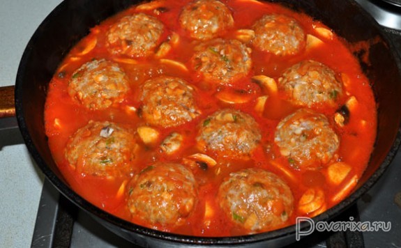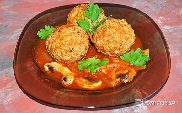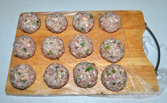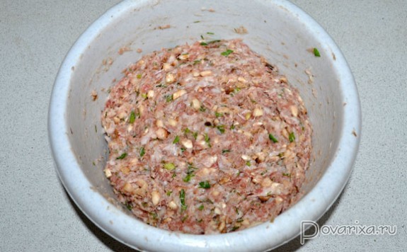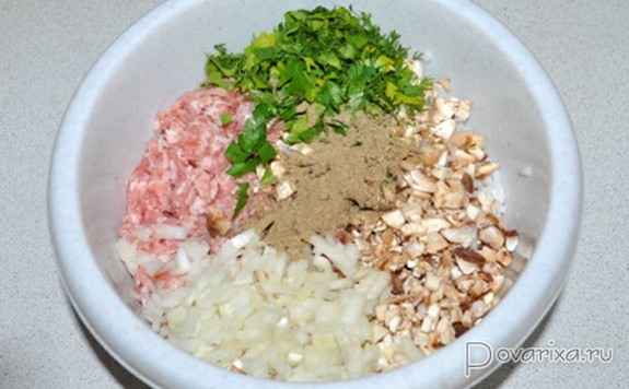 Сразу же поставить воду для риса, он будет готов через 15-17 минут варки под крышкой. А пока – очищаем (не моем!) грибы и рубим их мелко, кусочками по 5-6 мм (2-3 грибочка оставляем для соуса). Совсем мелко шинкуем 1 луковицу. Нарезаем укроп с петрушкой. Соединяем всё в миске с фаршем, посыпаем перцем, уцхо сунели, солью.