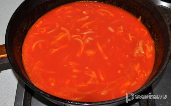 Вторую луковицу нарезаем полукольцами, натираем морковку. В сковороде, разогретой с маслом на среднем огне конфорки, пассеруем овощи 7-8 минут.