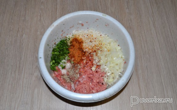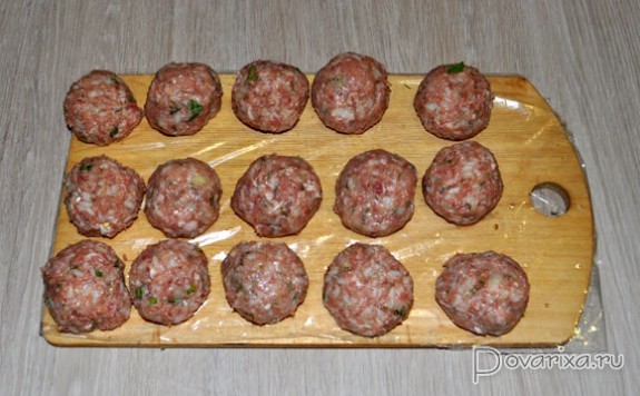 Если у нас есть заранее заготовленный и замороженный фарш, или только что купленный - для тефтелей мы его еще раз пропускаем через мясорубку с мелкой решеткой (или блендер). Добавляем рис, отваренный 10-12 минут, соль, перцы, приправу, зелень, мелко порубленную луковицу, воду, вымешиваем и 20-24 раза отбиваем.