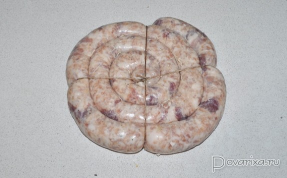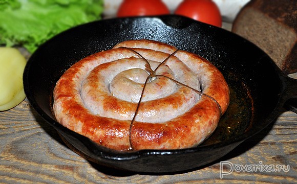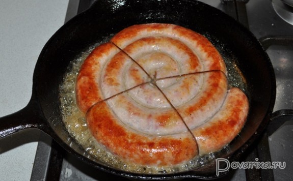 В сковороду вливаем масло, кладем круг колбасы и на небольшом огне жарим до готовности, по15-20 минут каждую сторону. Второй вариант – колбасу кладем в кастрюлю с холодной водой, отвариваем на небольшом огне (6-7 минут после закипания). Вынимаем, обсушиваем и обжариваем на среднем огне по 5-7 минут сторону.