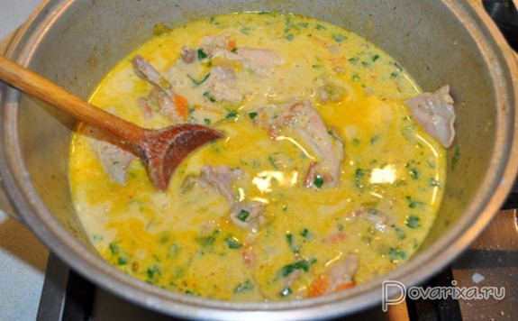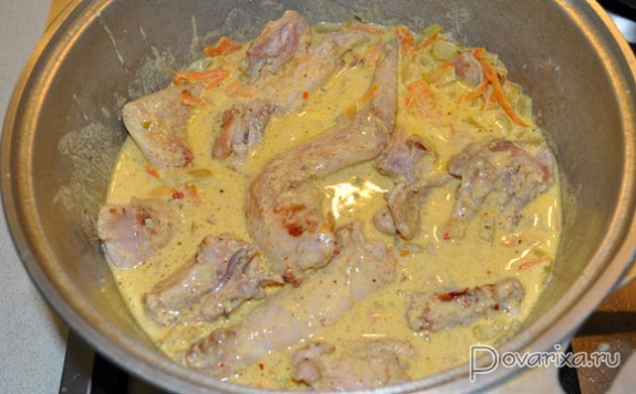 Вливаем бульон и сливки, кладем остаток горчицы, даем закипеть, перекладываем соус в казан. Пробуем на вкус – и добавляем немного сахара. Закладываем в соус куски мяса, солим, перчим, бросаем лавровый лист, а после закипания накрываем крышкой и оставляем блюдо тушиться на небольшом огне до полной мягкости мяса.
