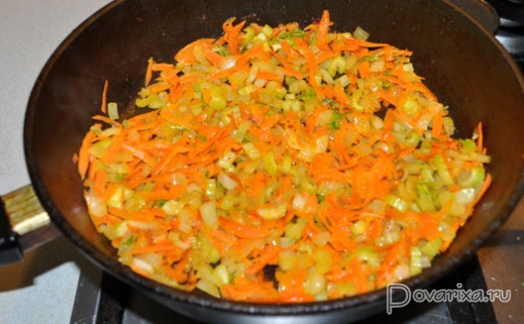 Когда все кусочки обжарены и сложены на тарелке, добавляем в сковороду еще немного масла, засыпаем нарезанные лук, сельдерей, морковь, пассеруем на среднем огне 5-7 минут, заливаем вино, и минут 5-6 овощи тушатся, пока вино выпаривается.