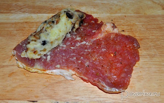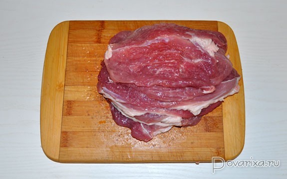 Да, мясо нам попалось не лучшее, но мы аккуратно, поперек волокон, нарезаем его на пласты по 9-10 мм и как следует отбиваем до возможной тонкости. Делаем это, закладывая мясо в просторный пищевой пакетик.