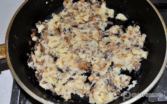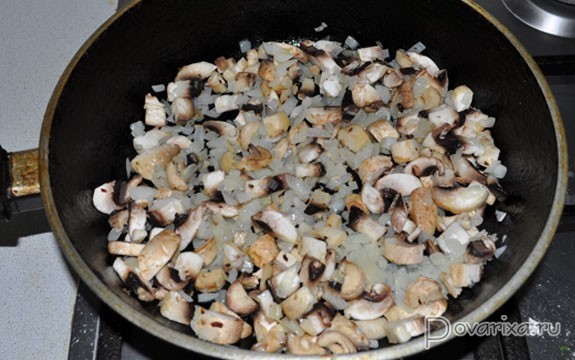 А на сковороде, на среднем огне, 9-10 минут пассеруем нашинкованный лук, и еще минут 10 обжариваем вместе с нарезанными кусочками грибами.