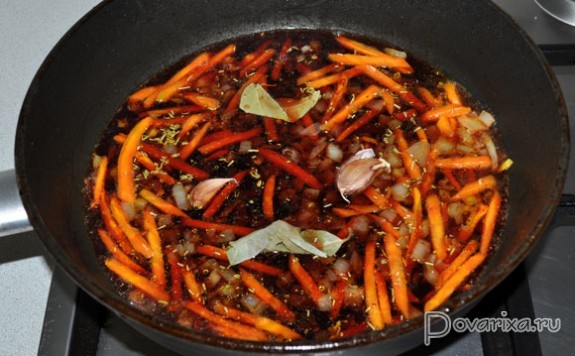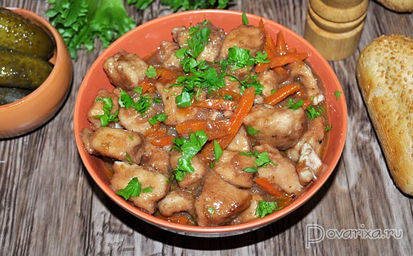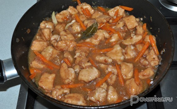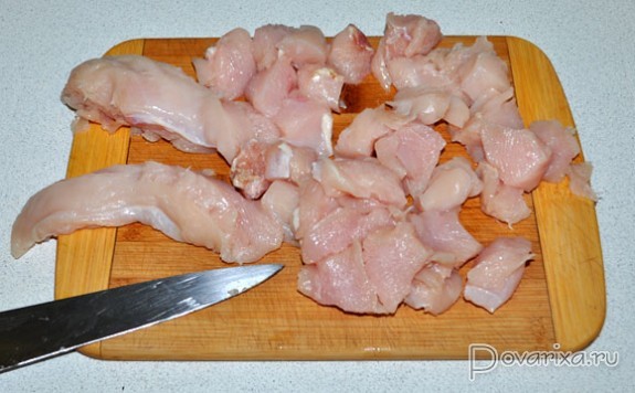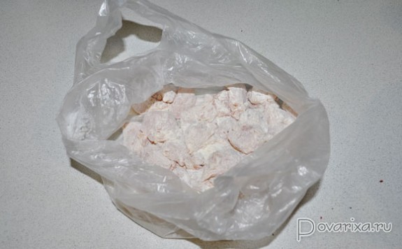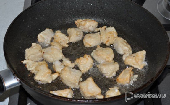 В это время кубики бекона обжариваются на сильном огне, когда жир вытопился – убираем на тарелку. Нет бекона – 4-5 минут перекаливаем в сковороде, тоже на сильном огне, масло. И тут же кладем половину кусочков кролика, обжариваем, переворачивая, 1-1,5 минуты. Убираем, жарим остальные кусочки, вынимаем.