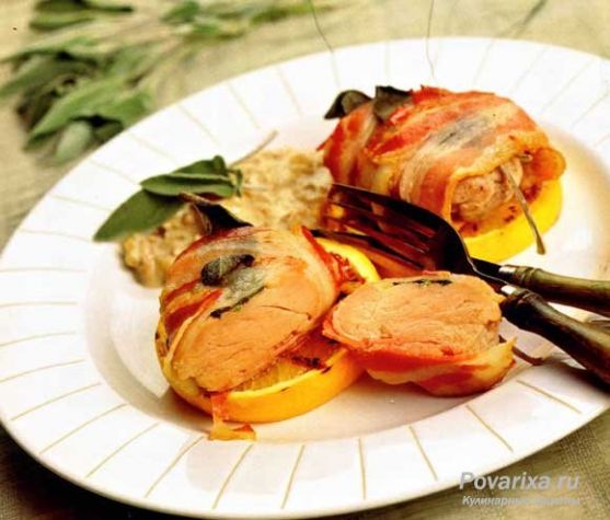 РусскаяМедальоны, запеченные в духовке, где лишний жир вытопится, а свинина пропитается ароматом подкопченного бекона и шалфея, поданные под вкуснейшим мясным соусом... И все это великолепие - за час времени.