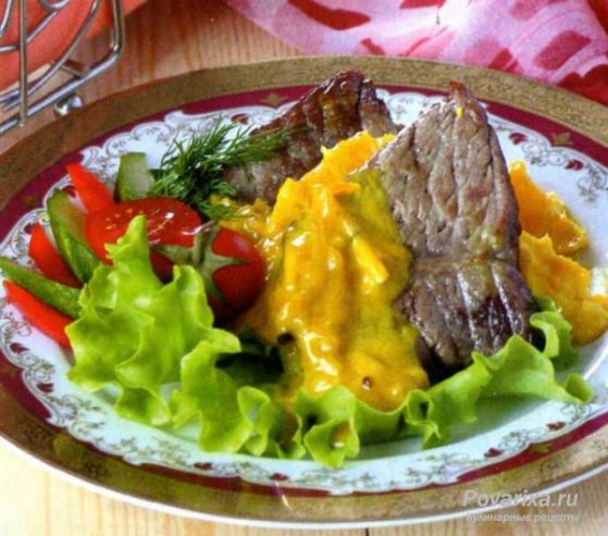 РусскаяДля приготовления медальонов необходим кусок телятины из спинной части или костреца, из которого мы приготовим отбивные, а к ним - фруктово-луковый соус, который и придаст им своеобразный и неповторимый вкус.