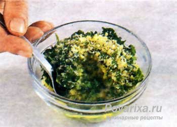 - Распускаем в сковороде сливочное масло, сливаем в миску - оно должно остыть. Тем временем мелко рубим вымытую и обсушенную петрушку, измельчаем ядра грецких орехов - в блендере или иным способом. Перемешиваем зелень и орехи с растопленным маслом. Солим по вкусу.