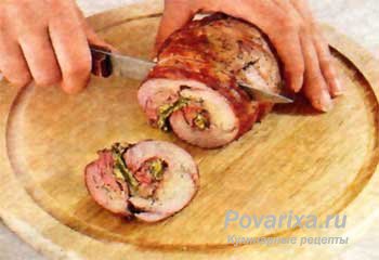 РусскаяГорячие, сочные ломти рулета из телятины, источающие смешанный аромат хорошо запеченного мяса, сыра и зелени - такое блюдо украсит праздничный стол. Удобен рулет и тем, что мясо можно замариновать заранее, а вынуть готовое блюдо из духовки как раз ко времени подачи на стол.