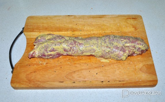 Натираем вырезку солью и перцем, слегка растертыми травами (можем взять также Итальянские, или укладываем на поверхности несколько листиков свежего, сушеного шалфея). По всей поверхности смазываем горчицей.