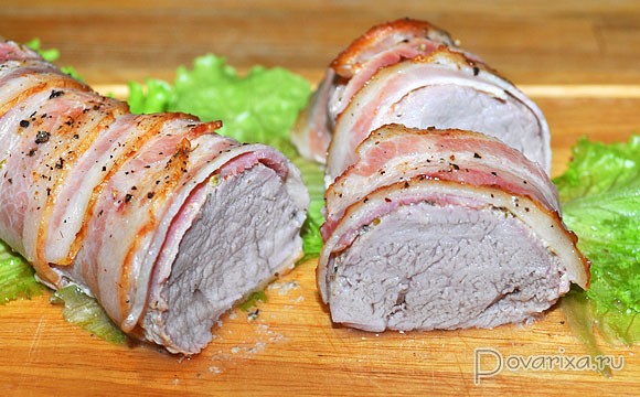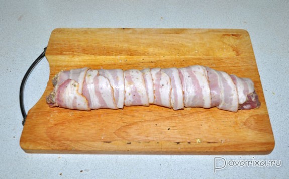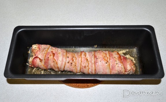 Чуть наискось плотно оборачиваем вырезку ломтиками бекона. Слегка посыпаем перцем.