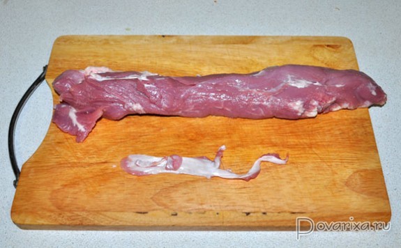 После промывания и обсушивания мяса острым небольшим ножом терпеливо срезаем с вырезки имеющиеся белые пленки. Если филе мы купили с тонким мясным «хвостиком» на его конце – стоит согнуть его и закрепить.
