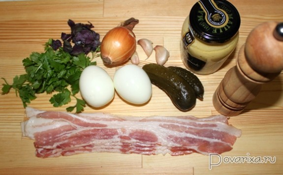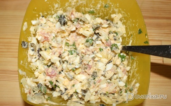 Для начинки рулетиков мелко рубим бекон, лук, огурцы, яйца, чеснок, кинзу и петрушку, добавляем для связи компонентов майонез, вымешиваем начинку.