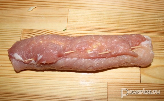 Сворачиваем плотные рулетики, края которых закрепляем зубочистками (деревянными).