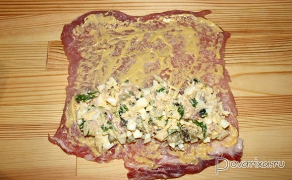 На каждый пласт мяса наносим по всей поверхности дижонскую горчицу, на нее – начинку, примерно на половину площади.