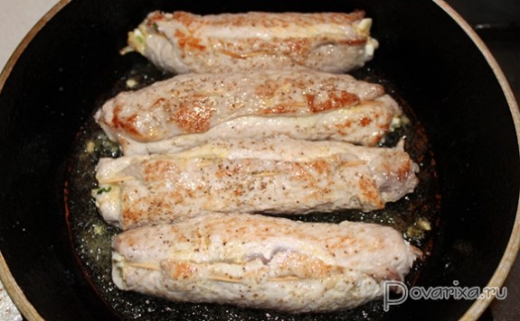 Растительное масло перекаливаем в большой сковороде, и, примерно по 3-4 минуты, до корочек, обжариваем рулетики, не снизив огня, минимум с двух сторон.