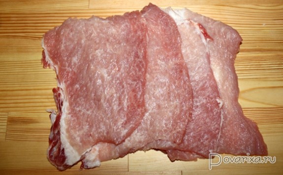 Кусок корейки промываем и максимально обсушиваем. Большим ножом делим ее на несколько пластов по горизонтали – у нас получилось 5 штук по 5-7 мм.