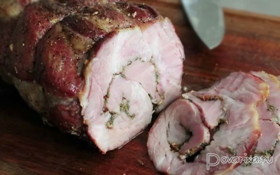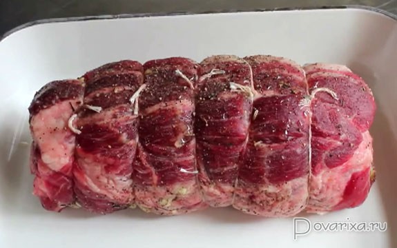 - Смазав поверхность оливковым маслом, посыпаем мясо солью, перцем, ароматными травами, цедрой, чесноком. И, конечно, мы легко сворачиваем красивый рулет, который остается только перевязать.