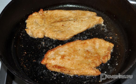 Отбивные кладем в дуршлаг, когда соус слит, панируем плотно в сухарях, предпочтительнее для этого – сухари домашние.
