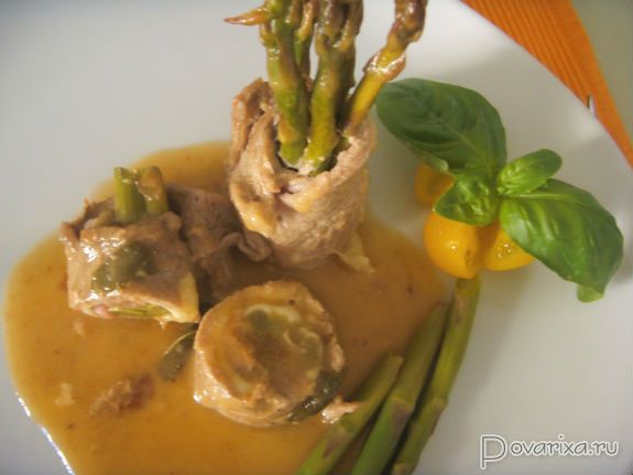 - А в сковороде, включив сильный огонь, даем закипеть смеси вина, оставленной ложки сливочного масла и отвара спаржи. Рулеты поливаем соусом, в качестве гарнира к ним подойдут запеченные или тушеные овощи.