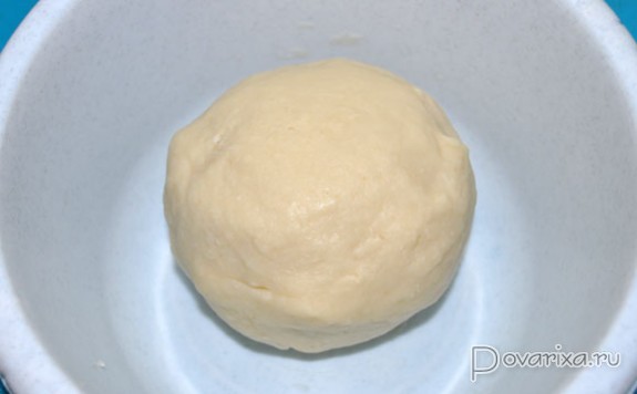 Тесто готовим такое же, как для куриной отбивной в тесте: кипятим воду, добавляем соль и масло, не спеша заливаем в просеянную муку, активно работая ложкой, замешиваем тесто. Выкладываем на стол, недолго месим его, в итоге скатывая в шар.