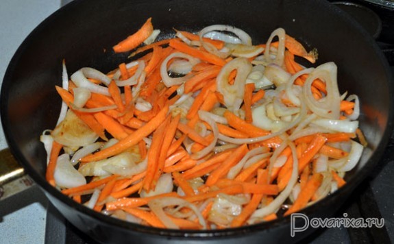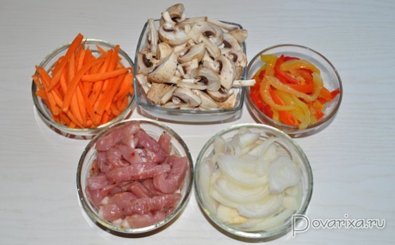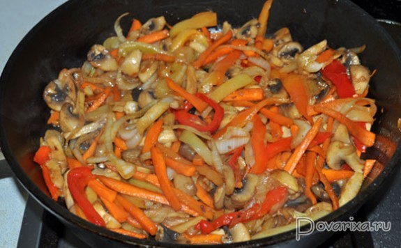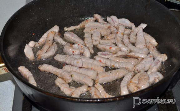 Ставим просторную толстодонную сковороду на самый сильный огонь, наливаем масло, ждем несколько минут, пока оно перекалится. Выкладываем мясную соломку, посыпаем перцем, обжариваем, перемешивая, примерно 2 минуты, ровно до того момента, когда мясо станет светлым и еще только начинает браться корочкой. Выкладываем в тарелку.