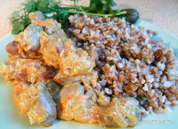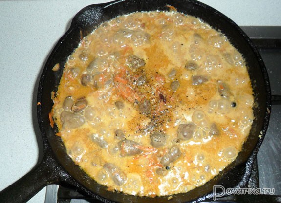 - Положив сметану, после закипания заливаем молоко. Теперь сердечки должны потушиться до готовности примерно 30-40 минут, в закрытой сковороде и, конечно, на слабом огне.
