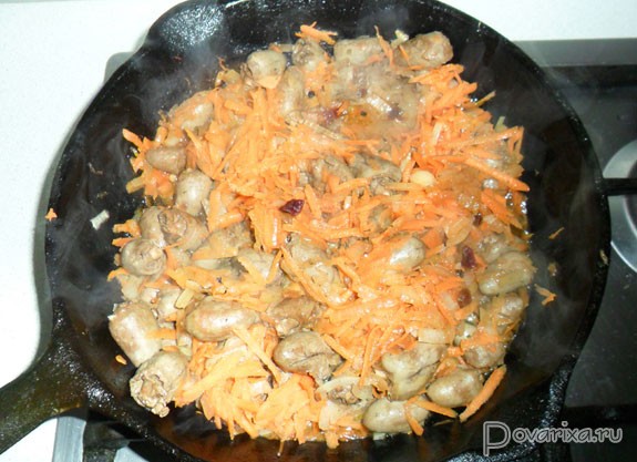 - Обсушиваем сердечки в бумажных полотенцах. Раскалив растительное масло, постоянно помешивая и переворачивая, пару минут обжариваем сердечки.