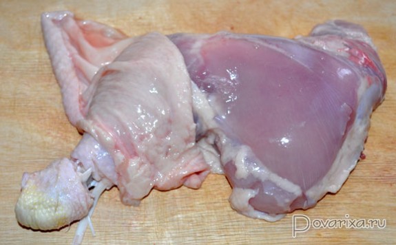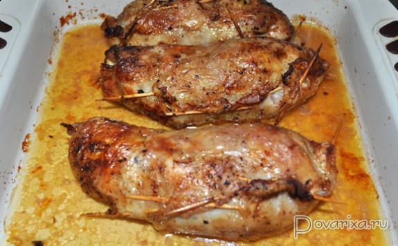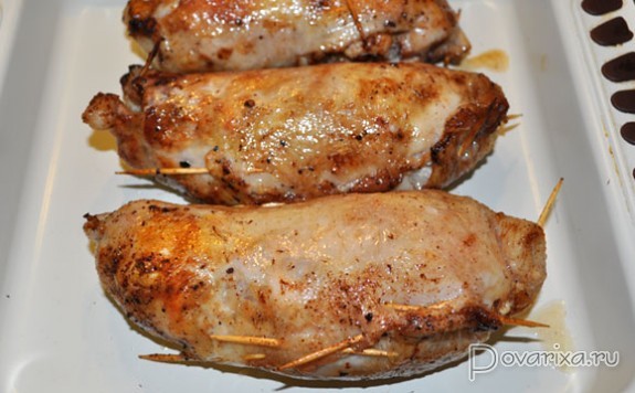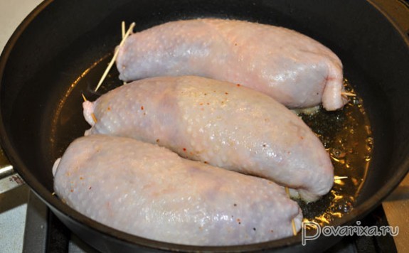 Жарим на сильном огне, но сначала 4-5 минут перекаливаем масло в сковороде, и только после этого выкладываем окорочка – вниз той стороной, где у нас зубочистки. Жарим до сильного подрумянивания в общей сложности 8-10 минут, по возможности – с 4 сторон. Окорочка в процессе немного «раздуваются», становятся толще и короче, но, если мы хорошо закрепили – соки не выпускают.