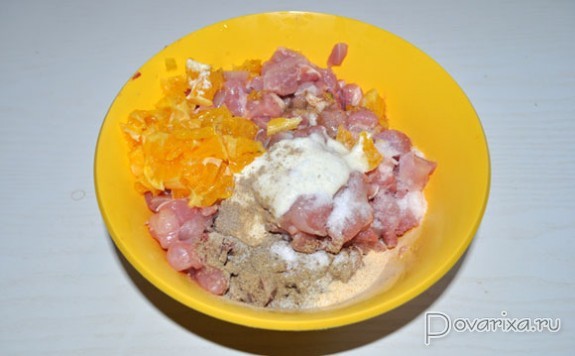 Куриное мясо срезаем и нарезаем его кубиками в 12-15 мм. Так же нарезаем свинину. Добавляем майонез, очищенный и порубленный мелким кубиком апельсин, соль, смесь перцев из мельнички, Прованские или другие травы, чеснок. И всю эту начинку хорошо вымешиваем.