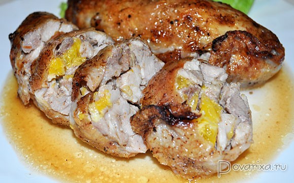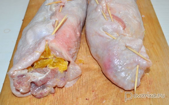Вынув форму, плотно накрываем фольгой, даем отдохнуть и дойти окорочкам 10-12 минут. Вынимаем зубочистки, нарезаем и подаем. Для гарнира хорош кус-кус, или отварной рис с чесноком и розмарином, или просто отварной рис.