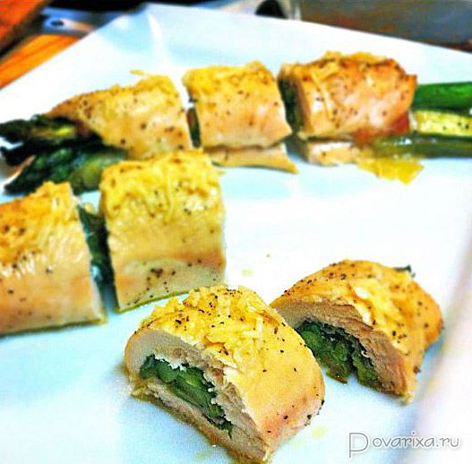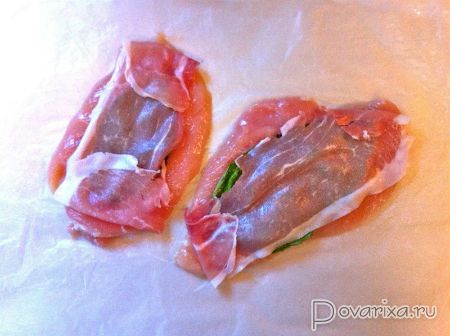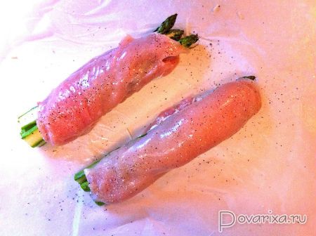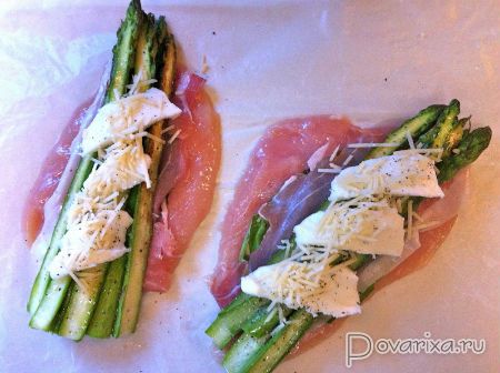 - На пласты филе выкладываем по 1-2 листочка базилика (или посыпаем сушеным), по ломтику ветчины, по половинке разрезанных вдоль малых филе, несколько стеблей спаржи. Немного солим и перчим. Сверху – по 2-3 ломтика моцареллы, слегка присыпанных пармезаном.