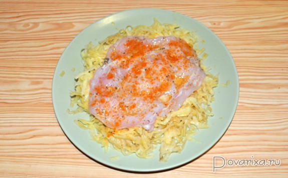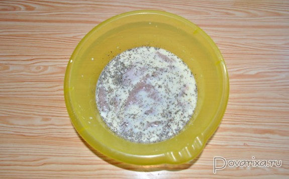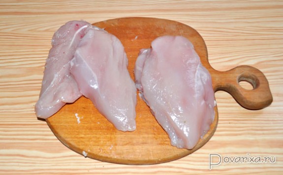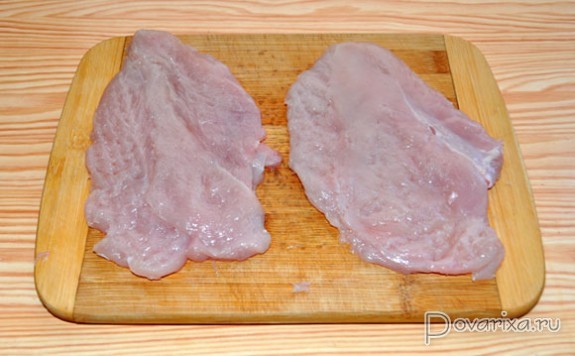Филе осторожно, но довольно сильно отбиваем деревянным молотком, причем лучше это сделать в пищевом пакете, потому что филе - очень нежное мясо, и не стоит превращать его в лохмотья.