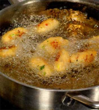 - Перекаливаем на сковороде с толстым дном растительное масло - его нужно налить примерно на 1 см высоты. На сильном огне жарим рыбные котлетки в кипящем масле не больше 3 минут на каждой стороне.