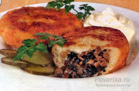 - Делим рыбный фарш на одинаковые части, делаем шарики, разминаем в лепешки. На середину кладем начинку, соединяем края и формуем котлеты круглой или овальной формы.