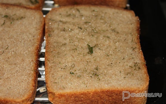 Куски филе размещаем на хлебе. Есть любимые травы вроде Итальянских - посыпаем.
