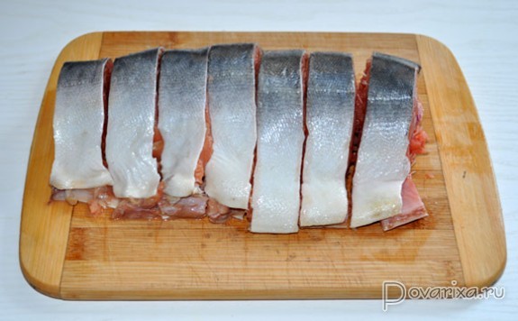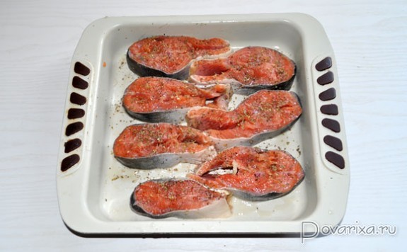 Каждый кусок горбуши натираем солью и перцем, выкладываем в смазанную растительным маслом форму для запекания или на противень, сбрызгиваем лимонным соком. Для более богатого аромата и вкуса можем посыпать Итальянскими или Прованскими травами и еще немного - майораном.