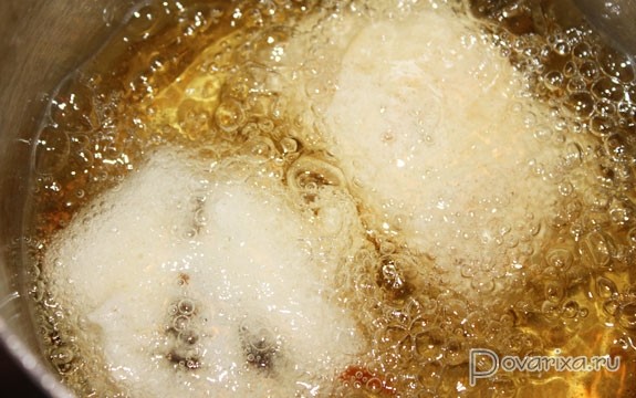 - Стейки амура панируем в муке, в том числе и боковые поверхности, и жарим в перекаленном растительном масле, не снижая сильного огня, до румяной корочки на одной стороне (примерно 2,5-3 минуты), минуты 2 на другой стороне, примерно по минуте – боковые поверхности (если куски у нас толстые), чтобы кожа стала хрустящей и вкусной.
