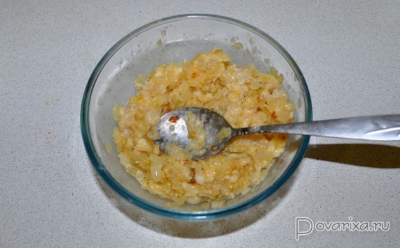 Мякоть измельчаем в блендере или мясорубке вместе с замоченными в молоке и отжатыми ломтиками батона. Для начинки нужен и лук, который мы шинкуем мелким кубиком и пассеруем 10 минут на сковороде с маслом, на среднем огне. И перемешиваем лук с фаршем из филе и хлеба, добавив и 1 яйцо. Приправляем солью, перцем.